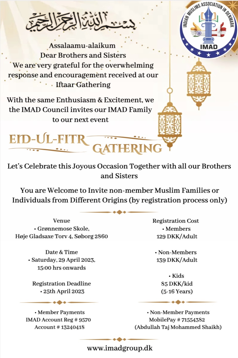 Home EID-UL-Fitr Gathering 2023 Date Apr 29 2023 Expired! Time 3:00 pm - 10:00 pm EID-UL-Fitr Gathering 2023 Please complete this registration form to attended the event Share this event + Add to Google Calendar + iCal / Outlook export The event is finished.